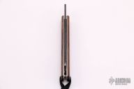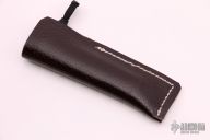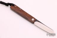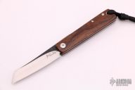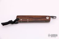 This knife by Kansei Matsuno features a satin/black finished blade with friction folder style opening. The handle has ironwood scales, stainless steel liners, barrel spacers and lanyard hole. Comes with a brown leather pouch. Excellent condition.