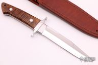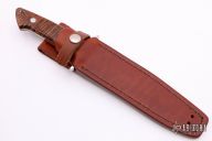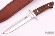 This Loveless style Fighter from James Sponaugle features a mirror polished blade with a sharpened top edge, .192" blade stock and 1.109" blade depth, full tapered tang construction. The handle has a mirror polished stainless steel guard, curly Koa wood scales with red liners and spacers, lanyard hole at the butt. It comes in a custom brown leather sheath. Excellent condition.