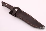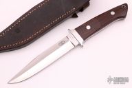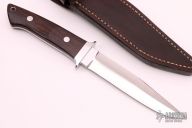 This Loveless Style Fighter from Richard A. Rotella features a polished clip point blade with sharpened top edge, .251" blade stock and 1.096" blade depth, full tapered tang construction. The handle is comprised of a stainless steel guard and ironwood scales over red liners. Lanyard tube in pommel. Includes leather sheath with belt loop. Excellent condition.