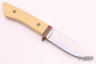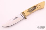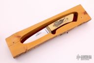 This hunter by TJ Yancey features a mirror finished blade with .175" blade stock and .944" blade depth, full tapered tang construction. The handle has a brass guard, yellow paper micarta scales with maroon liners/spacer, brass pins and scrimshaw on the handle, signed A. Yancey. Comes with a wooden display box. Excellent condition.