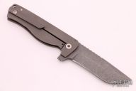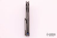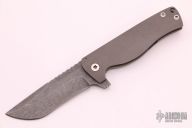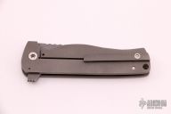 This P4 by Plunkett Blade Works features a dark tumble finished blade with notched thumbrest and flipper. The handle has a bead blasted titanium frame with matching tip up clip. Nice detent, lockup and blade seating. Comes with a COA dated 3-7-15. Has a couple light scuffs, otherwise excellent condition.