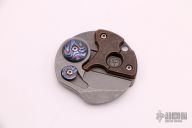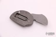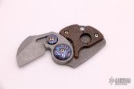 This Custom Coin Claw Gen 3 by Serge Panchenko features a stonewashed chisel ground wharncliffe blade with a timascus thumbstud and pivot collar. The handle is stonewashed titanium with a copper overlay. Has a detent to hold the blade in position open/closed, but it does not lock. Excellent condition.
