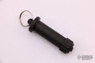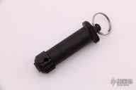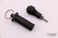 This pocket-size tool kit is a complete disassembly tool for the XM folder. It includes a built-in spanner wrench, which makes it very easy to hold both the wrench and the knife at the same time while making pivot adjustments. The head unscrews from the main body, which contains a precisely machined screwdriver blade that matches the slot on the pivot screw of the XM-18. The head will also hold any standard 1/4″ bit. In the case of the XM-18 it is a 5/64″ hex that works on the handle screws. The crossed drilled hole in the male end is there so you can use it as a “T” handle for extra torque. These are made from 17-4 PH hardened stainless steel, with a DLC finish. Has a couple light scuffs, otherwise excellent condition.