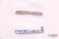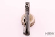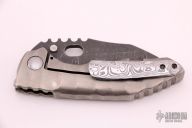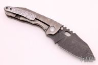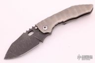This Draco integral from Dalibor Bergam features an acid washed blade with the Multi-Grind, notched thumbrest and thumbhole. The handle is sculpted from a single piece of titanium that has then been orange peel finished and sculpted, Damasteel pivot, tip up Damasteel clip. This knife comes with the original sculpted titanium clip and a mokuti clip. The blade is centered when closed, opens/closes smoothly, and locks up with absolutely no play. This piece is in excellent condition. Comes with leather pouch by Sasa SF.