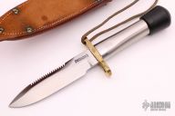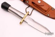 This Randall Model 18-5.5 has a carbon steel blade with sawteeth, brass fittings, and stainless steel handle (no knurling), this knife has the original "Crutch Tip", there is no threaded butt cap, just a crutch tip covering the hollow handle. This is how they were first made with the forward part of the tube crushed a little to fit the guard better. Comes with original leather sheath and stone. Has a few light scratches, otherwise excellent condition.