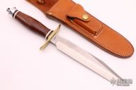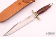 This Classic Fighter from Martin Knives features a satin finish clip point blade with sharpened top edge, .220" blade stock and 1.243" blade depth, hidden tang construction. The handle has a brass guard, with black/white linen micarta spacers, stacked leather finger grip handle and aluminum pommel. Includes original brown leather sheath with a stone.  The blade is stamped #1.  Excellent Condition.
