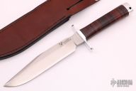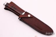 This Model 1-7 by Blackjack Knives features a satin finished blade with false top edge, .216" thick and 1.294" deep, hidden tang construction. Double aluminum guard, stacked leather grip with black spacers and a aluminum butt. Comes with brown leather sheath. Excellent Condition.