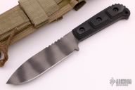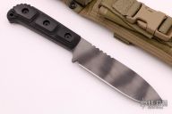 This MSS by Strider Knives features a tiger striped drop point blade with a notched thumbrest, .190" blade stock and 1.395" blade depth, full tang construction. The handle has black G-10 scales. Comes with a nylon tactical sheath. Has a few light scuffs, otherwise excellent condition.