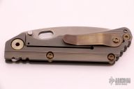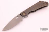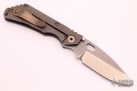 This DDC SNG by Duane Dwyer features a drop point chisel ground blade with thumbhole and dual thumbstuds. The handle has a milled and anodized titanium frame with an anodized reversible tip up clip, anodized barrel spacers and hardware. Comes with a zippered case. Excellent condition.