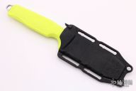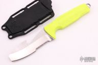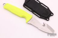 This dive knife by Benchmade features a satin finished blade with a strap cutter on the blade spine and hidden tang construction. .122" Blade Stock. 1.116" Blade Depth. The handle is yellow rubber. Comes with a black molded plastic sheath with leg straps, comes with original box. Light scratches are visible on the blade otherwise the knife is in excellent condition. N680 Blade Steel. Excellent condition.