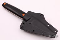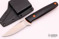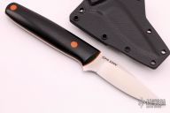 This knife by Dan Crotts features a satin finished blade, .095" blade stock and .800" blade depth, full tang construction. The handle has micarta scales with orange G-10 liners and pins. Comes with a kydex sheath with belt clip. New from maker.