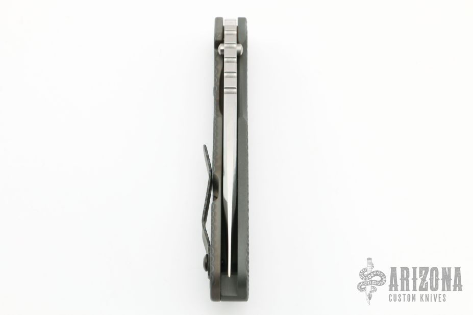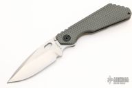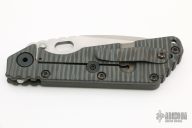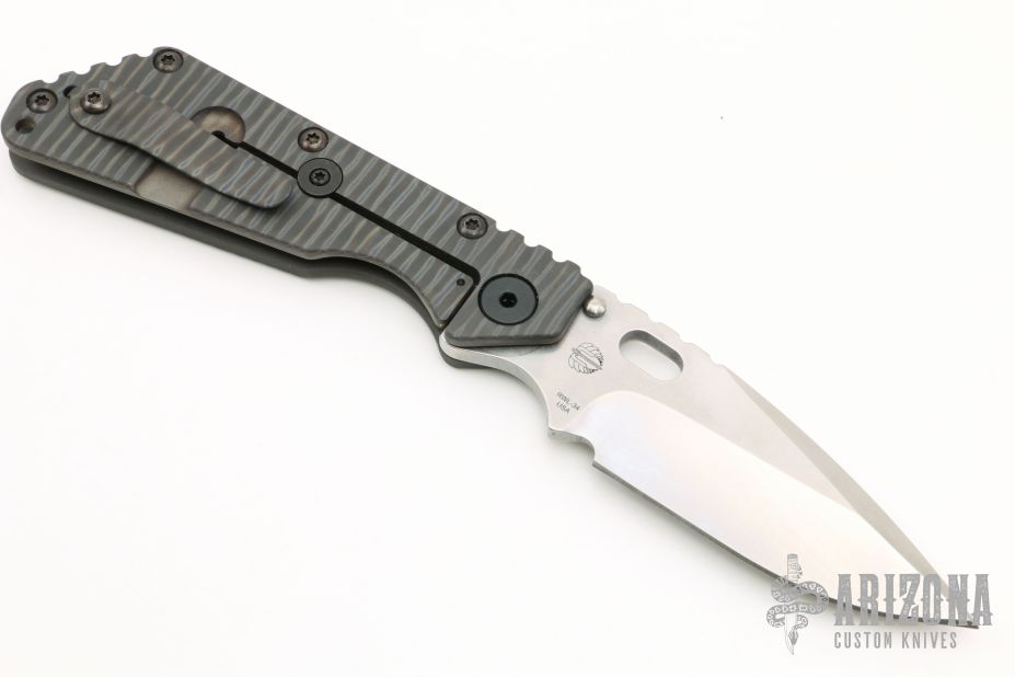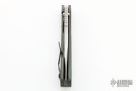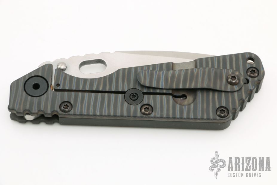 This SMF framelock folder by Mick Strider features a two-tone spear point blade and a dimple pattern grey aluminum and flamed titanium frame and tip up titanium clip. Includes a "Lock Bar Stabilizer" for maximum reverse lock retention. Nice detent, lockup and blade seating. Excellent Condition.