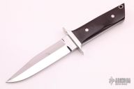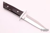 This Small Fighter by Mike Franklin features a mirror polished blade with sharpened top edge, .199" blade stock and .979" blade depth, full tapered tang construction. The handle has a stainless steel guard with maroon linen micarta scales. #270. Excellent condition.