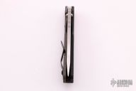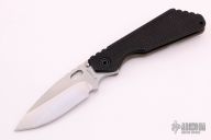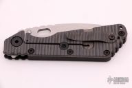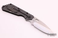 This SMF framelock folder by Mick Strider features a two-tone spear point blade and a dimple pattern black aluminum and flamed titanium frame and tip up titanium clip. Includes a "Lock Bar Stabilizer" for maximum reverse lock retention. Nice detent, lockup and blade seating. Excellent Condition.