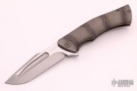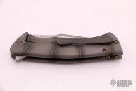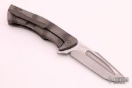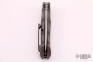 This Custom Mini S5 Flipper by Michael Zieba and Jason Knight features a two-tone recurve blade with fullers, notched thumbrest and flipper. The handle has a flame finished titanium frame with matching tip up clip with hidden screws, copper skull backspacer. Nice detent, lockup and blade seating. Rides on bearings. Has a copper bead. Comes with original box and papers dated 12-6-18. Excellent condition.