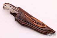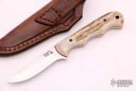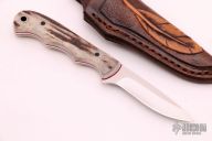This custom knife by Keith Murr features a mirror finished blade with notched thumbrest, .066" blade stock, .622" blade depth, full tang construction. The handle has stag scales with red liners. Great feel in the hand. Very nice work. Has some light scratches, otherwise excellent  condition. Includes a hand tooled brown leather sheath.