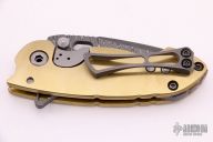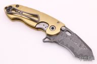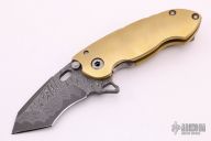This Solo Flipper by Direware Custom Knives features a San Mai Damascus tanto recurved blade with swedge, notched thumbrest, dual blade stops and flipper. The handle is comprised of a satin finished bronze frame with a blasted titanium clip is positioned for tip up carry, has an inlaid titanium lockbar. Comes with original box. Has some light patina on the brass, but it could be cleaned up pretty easily. Excellent condition.