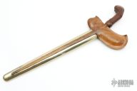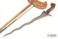 This antique Kris Dagger features a double edged blade with fullers and carved ricasso, .420" blade stock and 1.500" blade depth, hidden tang construction. The handle has a brass spacer, and carved wood grip. Comes with a beautiful scabbard with matching carved wooden throat and engraved brass scabbard. Has some scratches on the sheath and some oxidation on the blade, the tip of the wooden part of the sheath has broken off, otherwise good condition. Very interesting piece.