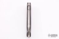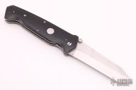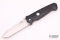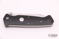 This D/A Auto by Shawn Vallotton features a hand rub satin finished tanto blade with dual thumbstuds. The handle has black G-10 scales, titanium liners and stainless steel backspacer. Nice action, lockup and blade seating. Has some scratches, otherwise good condition. The button to fire the blade is on the b-side of the handle.