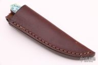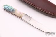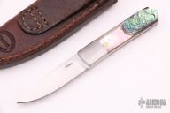 This knife by Eddy Elsmore features a hand rub satin finished blade with .131" blade stock and .644" blade depth, full tapered tang construction. The handle has dovetailed satin stainless steel bolsters, abalone scales and red liners. Comes with a brown leather sheath. Excellent condition.
