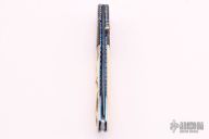 This linerlock folder by Mike Sanders features a colored Damascus blade with fileworked spine and single thumbstud with yellow stone. The handle is comprised of mosaic Damsacus bolsters and mammoth ivory scales over fileworked and anodized titanium liners and a tumbled and fileworked aluminum backspacer. #1364 on blade. Excellent condition.