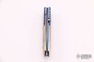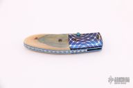 This linerlock folder by Mike Sanders features a Damascus blade with single thumbstud. The handle is comprised of dovetailed colored mosaic Damsacus bolsters and mammoth ivory scales over anodized titanium liners and a fileworked aluminum backspacer. #1219on blade. Has some light scratches, otherwise excellent condition.