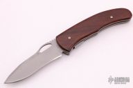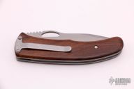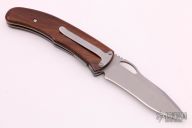 "The Lobo automatic is a double-action automatic knife that can function as a one handed opening locking-liner knife or be instantly fired in the automatic mode. The Lobo has a 3.5 inch blade to handle any cutting chore and a convenient stainless steel pocket clip. The automatic firing mechanism is hidden under the handle and is activated by sliding the left side handle scale towards the top of the knife. Because there are no apparent buttons on the outside of the handle the fact that the Lobo is an automatic is known only to its owner. This makes the Lobo convenient to carry and use anywhere." This Lobo features a bead blasted blade and ironwood handle. Has a few light scuffs, otherwise excellent condition.