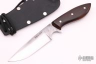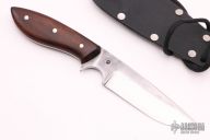 This Knife by Alex Horn, who was an Apprentice under Master Smith Murray Carter, features a two-tone San Mai blade .129 " Blade Stock.  1.037" Blade Depth.  The handle has wood scales and nickel silver pins over a tapered tang construction. Comes with a kydex neck sheath. Has some light scratches, otherwise excellent condition.