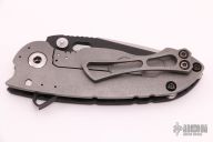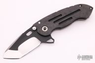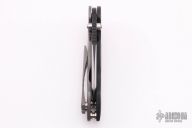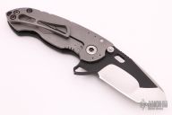 This S-90 Flipper by Direware Custom Knives features a two-tone compound ground drop point blade, notched thumbrest, and flipper. The handle has a marble carbon fiber and bead blasted titanium frame with a matching titanium clip is positioned for right hand, tip up carry. Great blade seating, detent and lock up.  Includes a padded zippered case.  Excellent Condition.