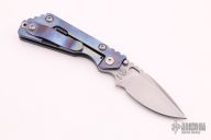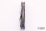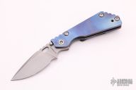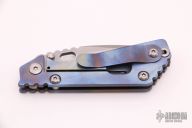 This PT by Mick Strider features a stonewashed blade with notched thumbrest and thumbhole. The handle has a blue anodized titanium frame with matching tip up clip. New condition.