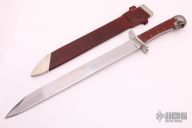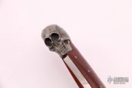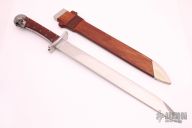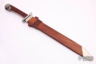 This Short Sword by Greg Benway features a mirror polished blade with sharpened top edge and fileworked spine, .311" blade stock and 1.492" blade depth, full tang construction. The handle has a stainless steel guard, wood scales with nickel silver pins, skull at the butt. Comes with a wooden scabbard with nickel silver collar and tip. Has some scratches, otherwise excellent condition. Comes with a sword bag.