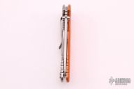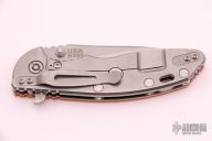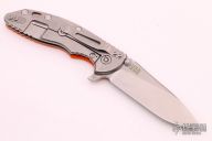 This Skinny XM-18 3.5" flipper by Rick Hinderer features a stonewashed blade with notched thumbrest and flipper. The handle has a stonewashed titanium frame with an orange G-10 scale, a tip up or down reversible titanium clip and filler tab, lanyard hole at the butt. Excellent condition. Comes with original box and extra hardware.