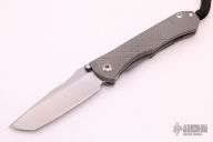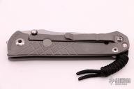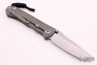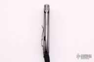 This Unumzaan from Chris Reeve Knives features a tanto style stonewashed blade with dual thumb studs and notched thumbrest. The handle is comprised of bead blasted and milled titanium with matching tip up clip. Lanyard pin with lanyard and spacer bead in pommel. Has a scuff/mark on the frame, otherwise excellent condition.