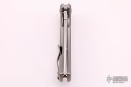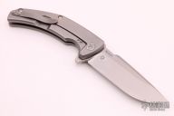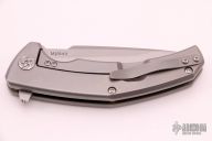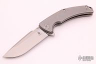 This knife by Kizer has a stonewashed blade with a notched flipper tab.  The handle has a bead blasted titanium handle with a matching tip up pocket clip.   Light scratches are visible on the blade and handle otherwise the knife is in good condition.