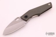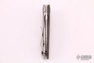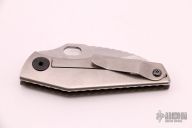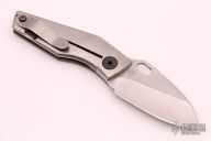 This SJ75 Baby Huey framelock folder by Strider Knives has a tumble finished blade and a green G10 and milled titanium frame with tumbled tip up titanium clip. File work on blade spine and inner edges of frame along the spine. Has scratches on the clip, otherwise excellent condition. Nice detent, lockup and blade seating.