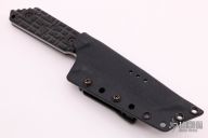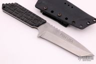 This knife by Strider Knives features a stonewashed tanto blade with notched thumbrest, .195" blade stock and 1.556" blade depth, full tang construction. The handle has milled black G-10 scales, lanyard hole. Comes with a kydex sheath with TekLok. Excellent condition. "Real World Products. Real World Performance." on front of blade, "FHN USA" on back of blade.