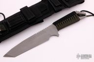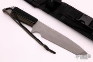 This knife by Strider Knives features a bead blasted tanto blade with notched thumbrest, .253" blade stock and 1.583" blade depth, full tang construction. The handle has black/green paracord wrap, lanyard hole. Comes with a black nylon sheath. Excellent condition. "Real World Products. Real World Performance." on front of blade, "FHN USA" on back of blade.