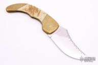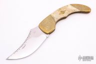 This Model 15 by Wayne Goddard is #1, it features a mirror polished clip point upswept blade with nail nick and a fileworked blade spine, .150" blade stock and 2.635" blade depth. The handle has engraved brass bolsters, front and rear, elk horn covers with engraved brass star escutcheon, engraved brass pins, engraved brass liners, and a polished steel spring. Has some light scratches, otherwise excellent condition. This thing is huge. Comes with a zippered case.