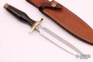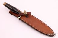 This Model B Dagger by Ralph Bone is marked "KIT" on the ricasso, which I am assuming means that the blade was a part of a Kit and was not completed by Ralph Bone. It features a mirror polished double edged blade, .174" blade stock and 1.052" blade depth, hidden tang construction. The handle has a brass guard and butt cap, and wood handle with red/white spacers. Blade is marked "B KIT". Has some light scratches and patina, otherwise excellent condition. Comes with a brown leather sheath, but the snap is broken.