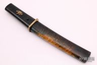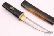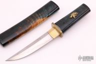 This Tanto by Scott Slobodian features a hand rub satin finished blade with a nice hamon and a hidden tang construction, .224" blade stock and .905" blade depth. The handle has a brass habiki and tsuba, tsuka and saya are composed of wood. Has a few very light scratches, otherwise excellent condition.
