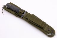 This MidTech Combat Raven by Rob Simonich features a tiger stripe coated tanto blade with a sharpened top edge, .213" blade stock and 1.297" blade depth, full tang construction. The handle has black G-10 scales, extended tang with lanyard hole. Comes with original Black Hawk sheath. Excellent condition.