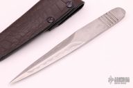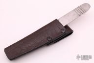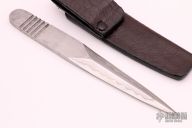 This knife by ITAC features a dagger style double edged blade with nice hamon, .265" blade stock and .924" blade depth, full tang construction. Comes with a leather covered kydex sheath and zippered case. Has some light oxidation, otherwise excellent condition.