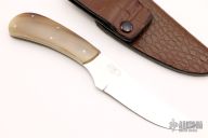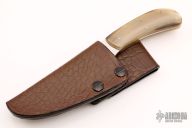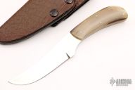 This knife by George Muller features a hand rub satin finished blade with mirror polished flats, .124" blade stock and .981" blade depth, full tapered tang construction. The handle has blonde horn scales and stainless steel pins. Comes with a leather over kydex sheath and a zippered case. Has a few light scratches, otherwise good condition.