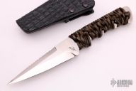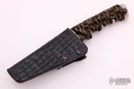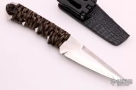 This knife by Larry C. Mensch features a hand rub satin finished double-edged blade with serrated top edge, .159" blade stock and 1.296" blade depth, full tang construction with paracord wrapped handle. Comes with a leather over kydex sheath and a zippered case. Has some light scratches, otherwise good condition.
