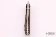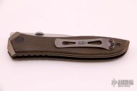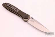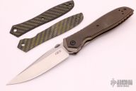 This knife by Zero Tolerance is an Emerson design. It features a two-tone blade with thumbdisc. The handle has custom green canvas micarta scales, stonewashed titanium frame and tip up titanium clip, left or right reversible. Comes with original box, carbon fiber scales and papers. Excellent condition. s/n 4032