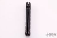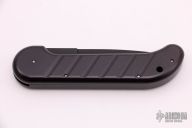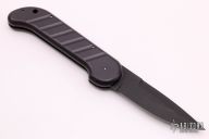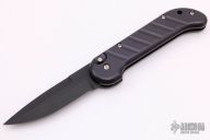 This Black Knife features a black coated spear point blade with swedge. The handle has a black anodized machined aluminum frame with a lanyard hole in the pommel. Excellent Condition.