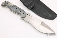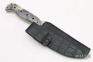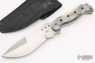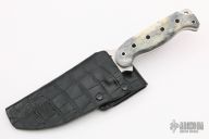 This knife by Boekoe Knives features a satin finished blade with false top edge and notched thumbrest, .191" blade stock and 1.806" blade depth, full tang construction. The handle has bone scales with red/white liners. Comes with a leather over kydex sheath and a zippered case. Excellent condition.