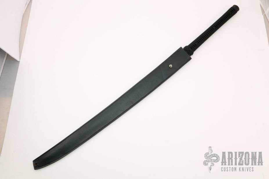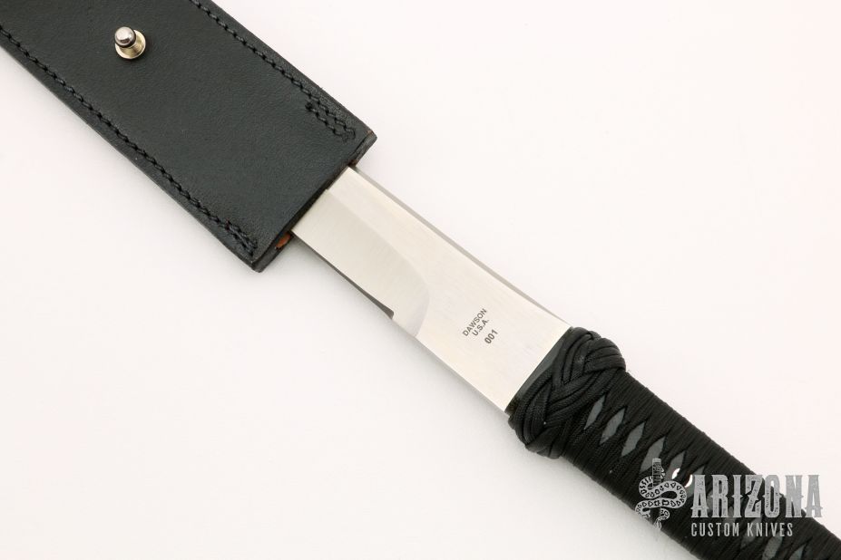 This Katana from Barry Dawson features a satin finished blade, .241" blade stock and 1.384" blade depth, full/hidden tang construction. The handle is comprised of black paracord Japanese style wrap over black canvas micarta. Includes a black leather sheath. Excellent condition. marked "001"