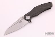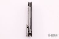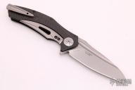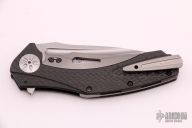 This discontinued 0777 Flipper (#0558) has a M390 drop point blade with fullers, notched thumb rest and flipper. Handle is black carbon fiber with titanium frame lock and adjustable lock stop, satin finished titanium deep carry tip up clip, titanium milled spine spacer, and satin finished stainless steel pivot. Knife is in excellent condition, shows no signs of use/carry. Includes original box.