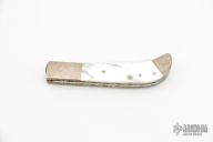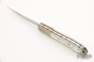 This slipjoint by Bill King features a hand rub satin finished blade with a nail nick. The handle has jeweled and dovetailed nickel silver bolsters, mother-of-pearl scales, fileworked nickel silver liners, stainless steel backspacer. Has some light scratches, otherwise excellent condition.